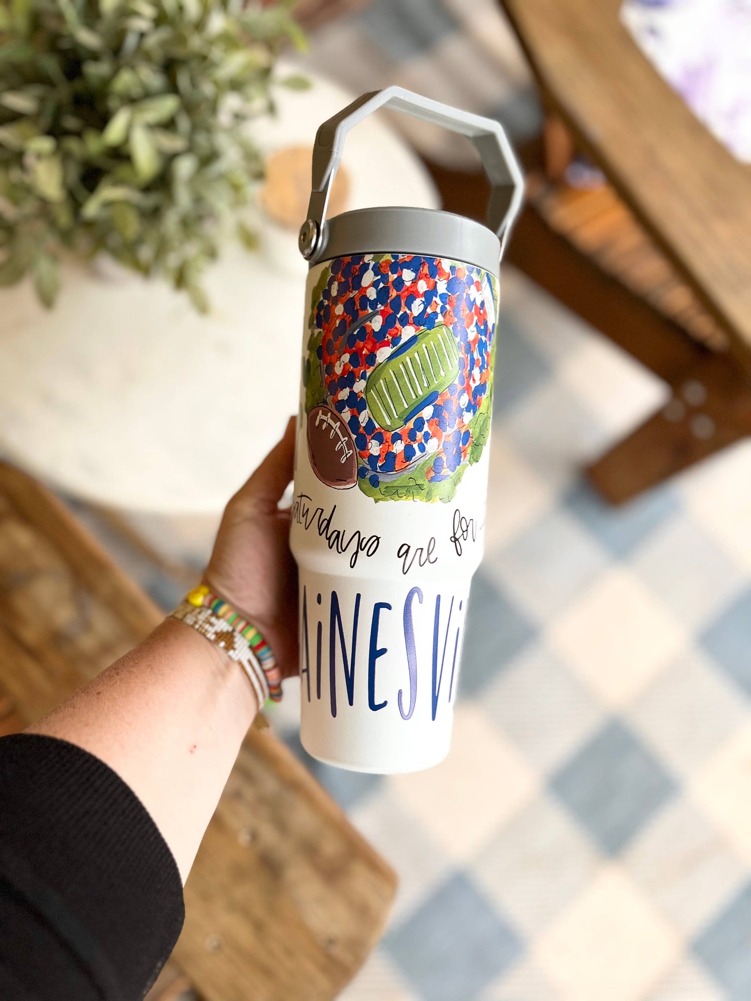 Pre-Order now! These 30 oz tumblers are sure to turn heads! Cute tumbler with one of a kind art work displaying all the things that make Gainesville so special on a Saturday! Comes with a flip lid and a handle making this 30 oz drink perfect for on the go and extra easy to carry! Designed by Rachel Walker.