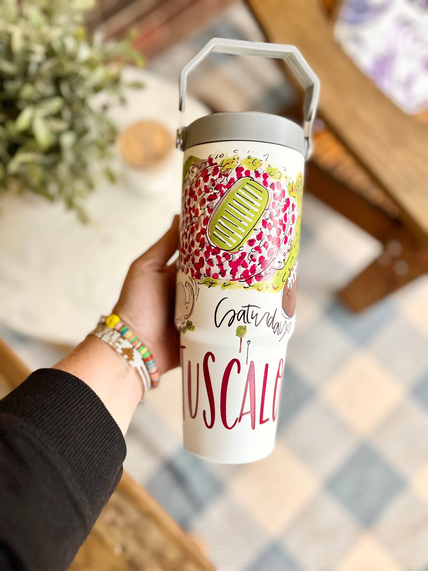 These 30 oz tumblers are sure to turn heads! Cute tumbler with one of a kind art work displaying all the things that make Tuscaloosa so special on a Saturday! Comes with a flip lid and a handle making this 30 oz drink perfect for on the go and extra easy to carry! Designed by Rachel Walker.