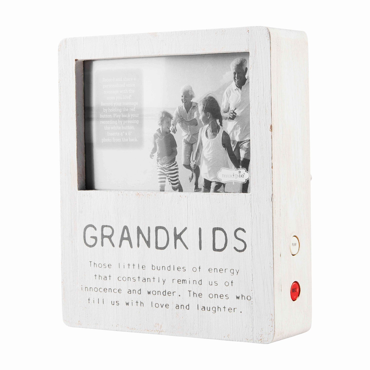 Our Grandkids Voice Recorded Picture Frame is the perfect memory maker. The wooden 4" x 6" frame features side buttons that record and play voice messages. The front of the frame reads "Those little bundles of energy that constantly remind us of innocence and wonder. The ones who fill us with love and laughter"