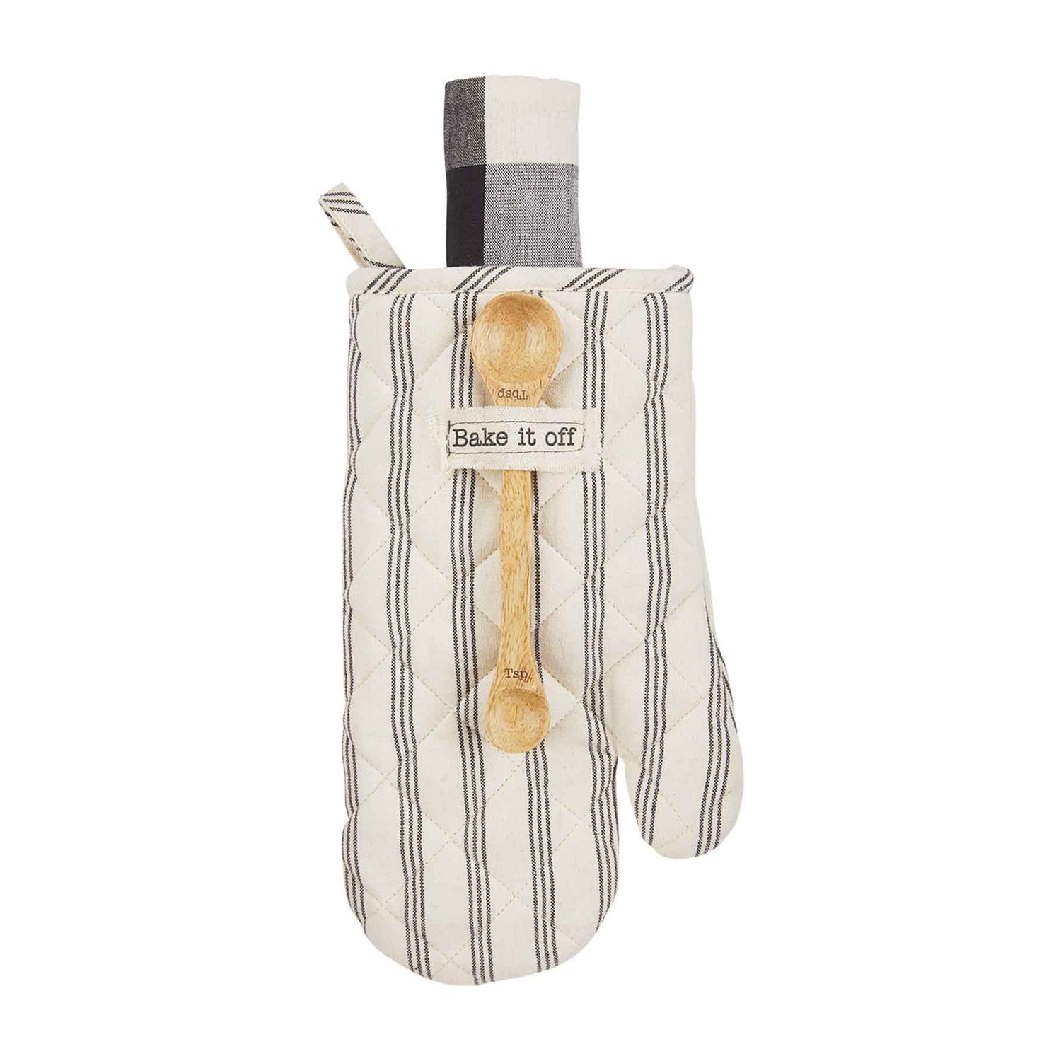 Bake it off with our Bake It Off Oven Mitt Set. The set comes with a woven cotton oven mitt with washed canvas patch that reads "Bake it off". The set also comes with a chambray hand towel and engraved double-sided mango wood tablespoon and teaspoon measuring spoon.