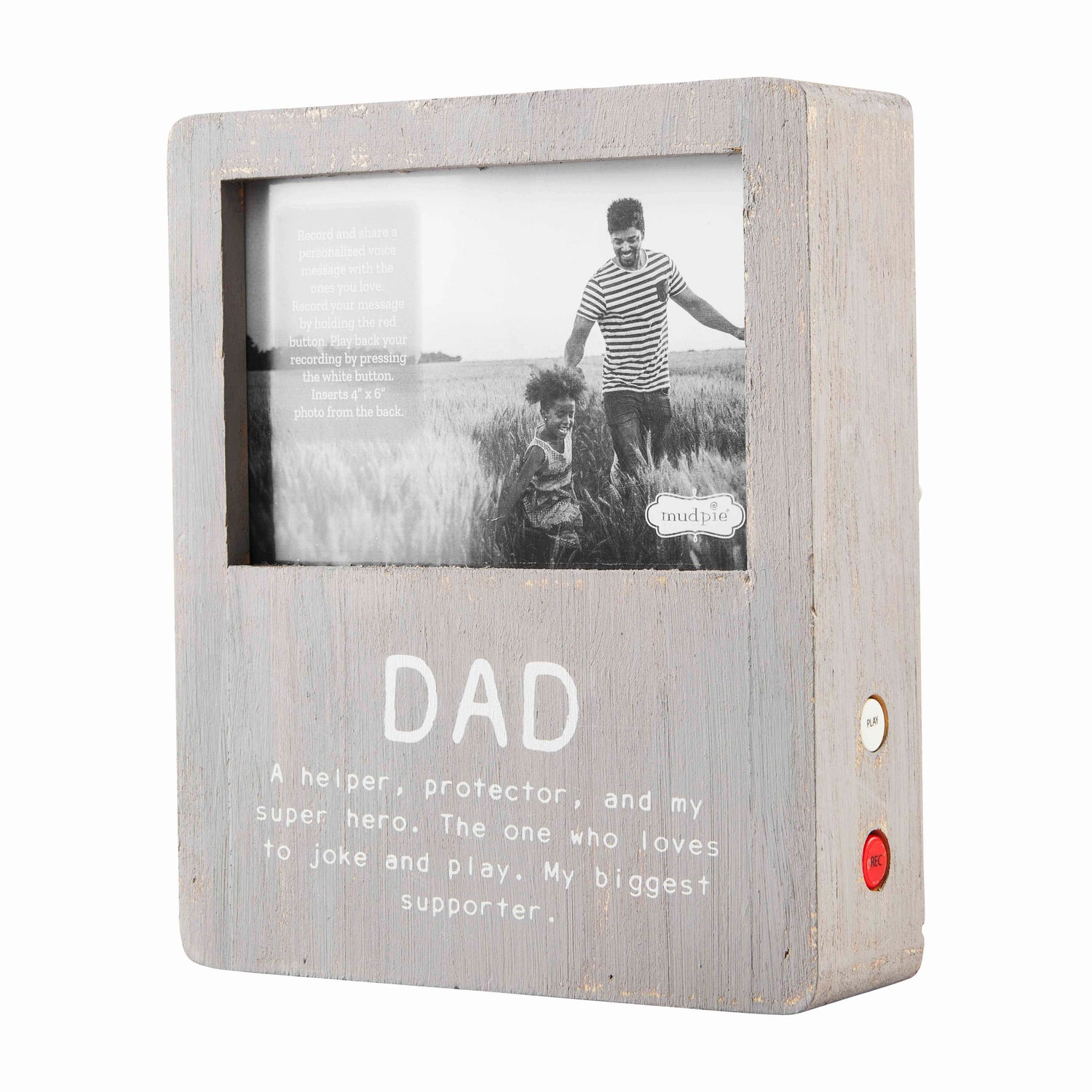 Our Dad Voice Recorded Picture Frame is the perfect memory maker. The wooden 4" x 6" frame features side buttons that record and play voice messages. The front of the frame reads "A helper, protector, and my super hero. The one who loves to joke and play. My biggest supporter".