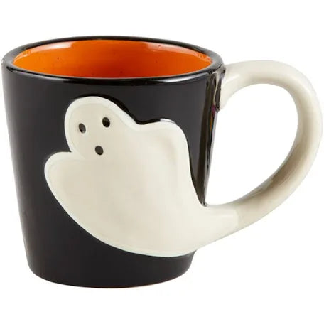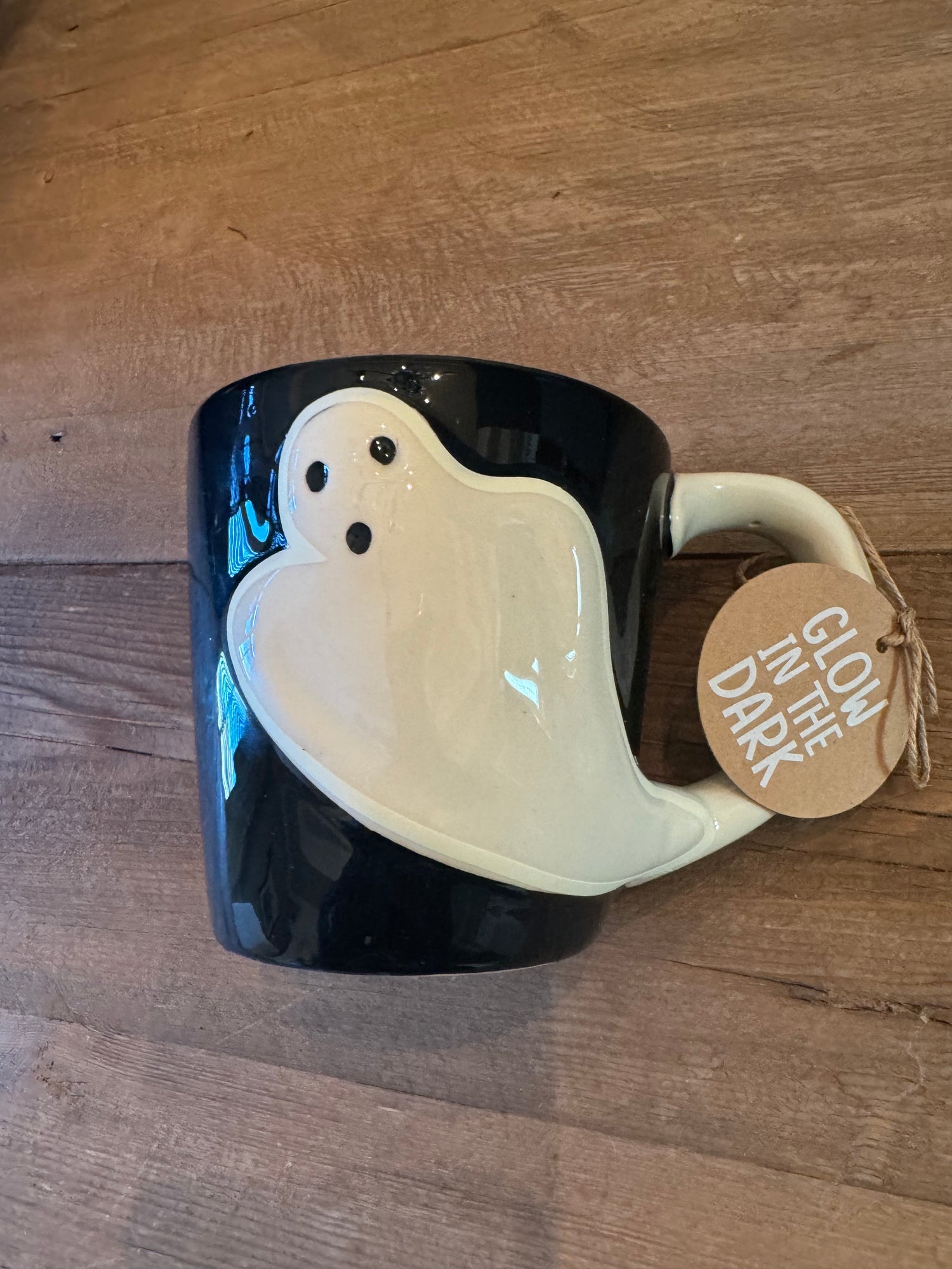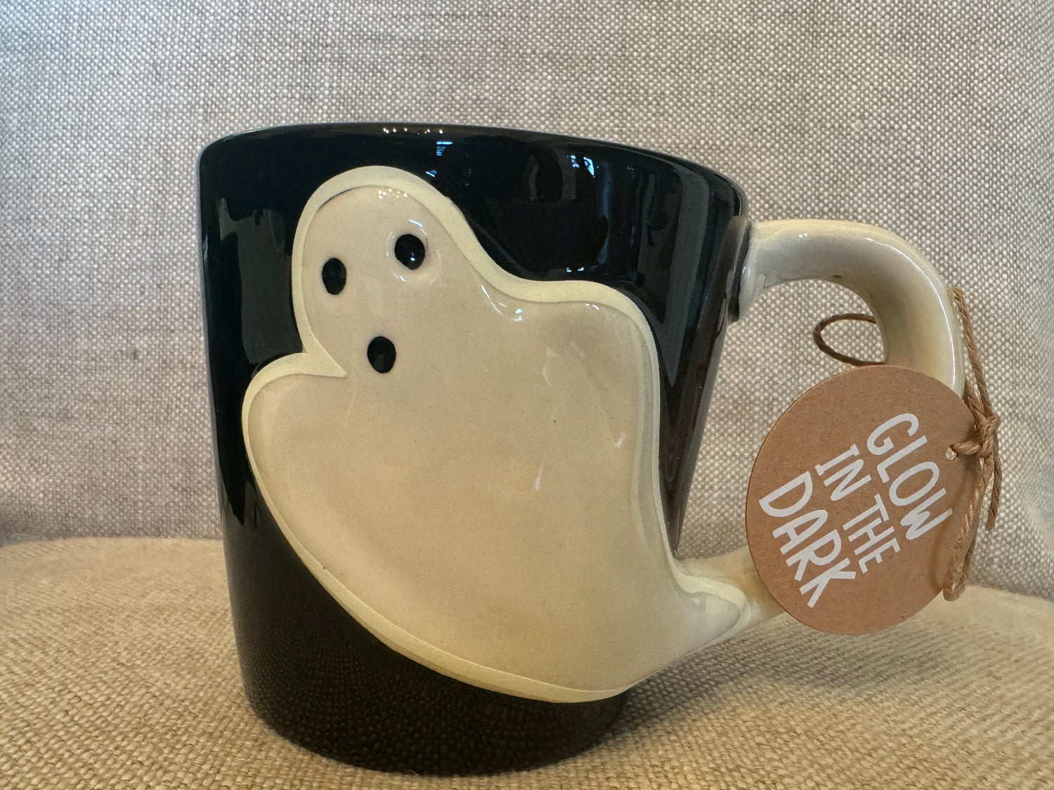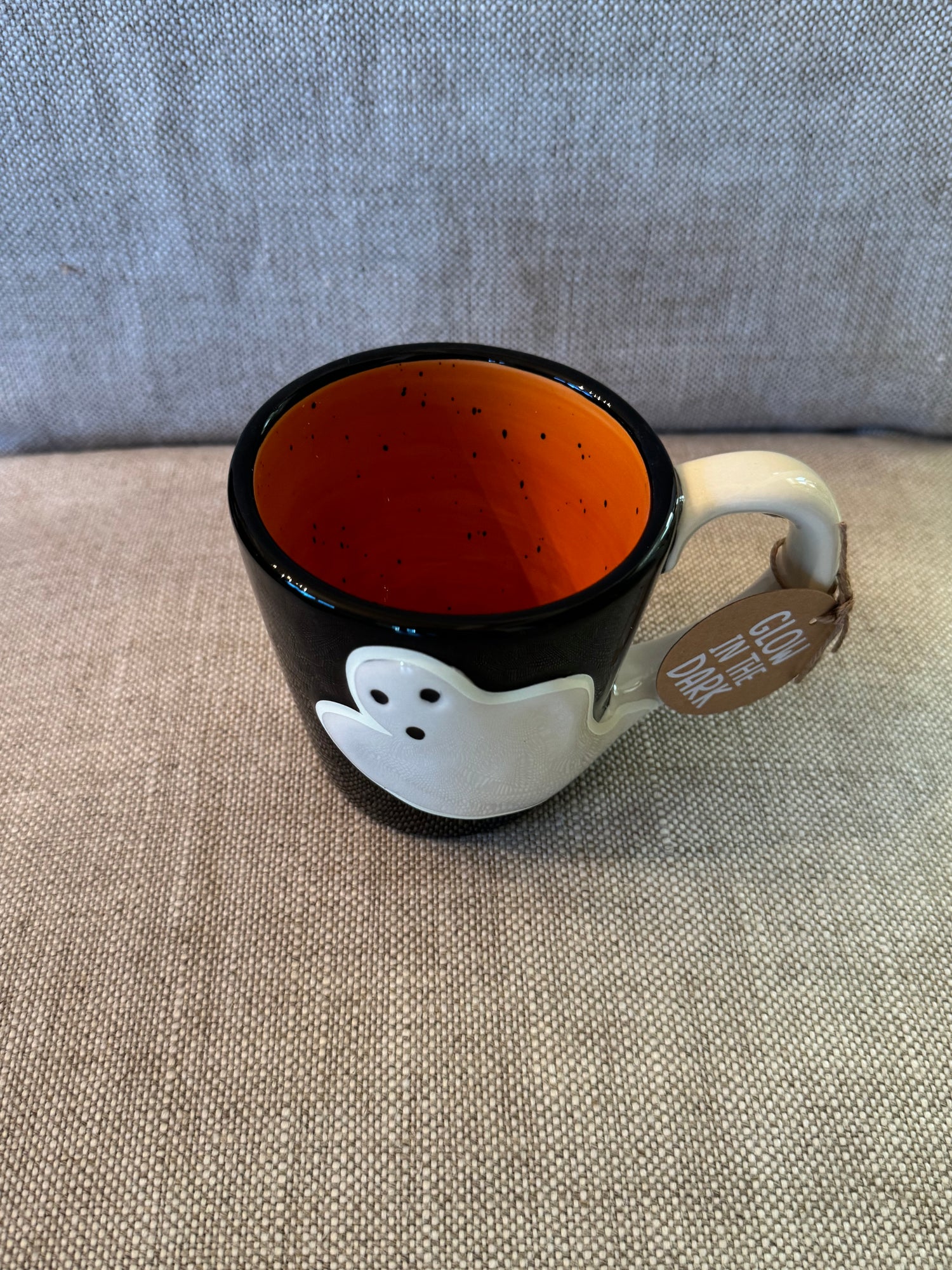 Hand-painted ceramic mug features glow-in-the-dark glaze and figural handle.