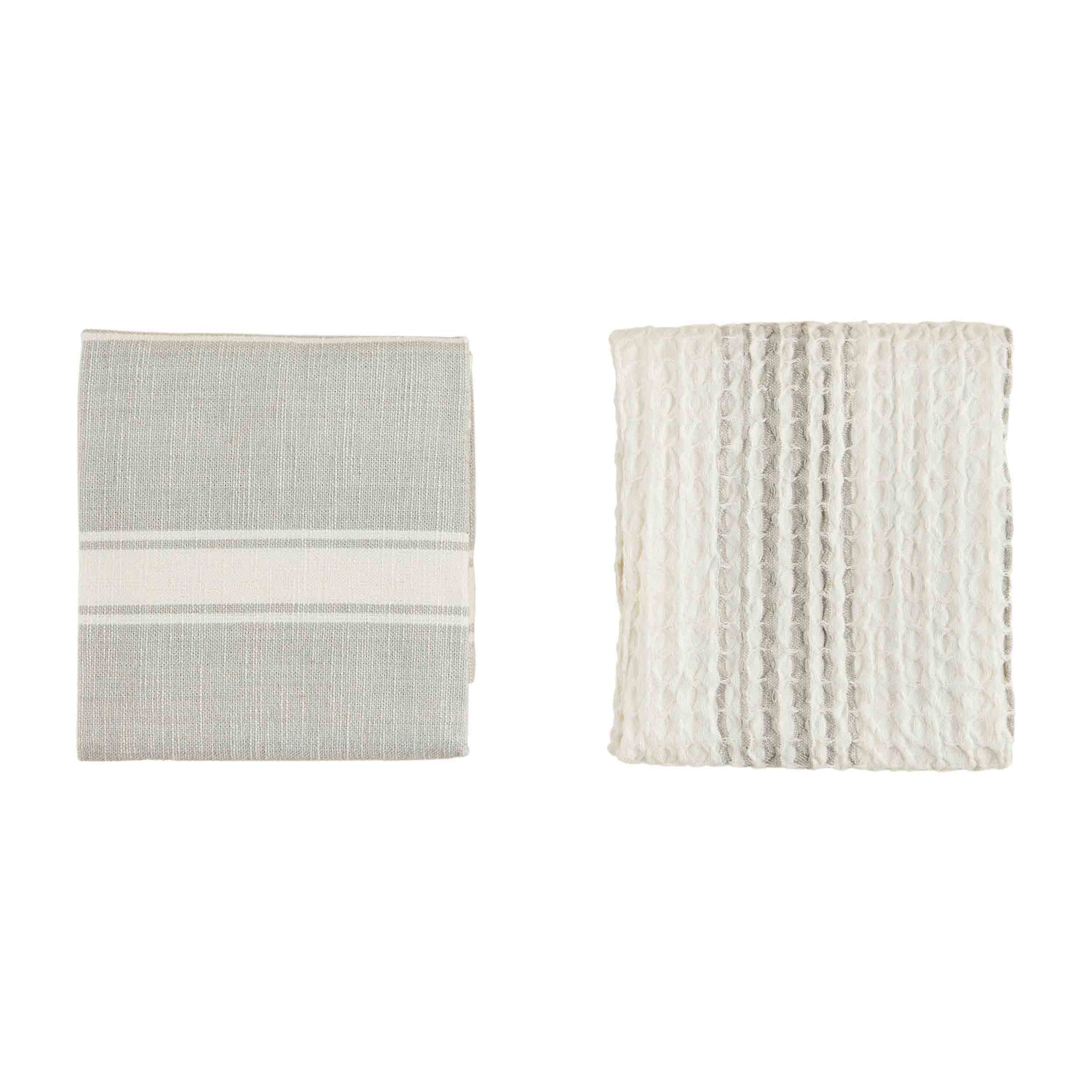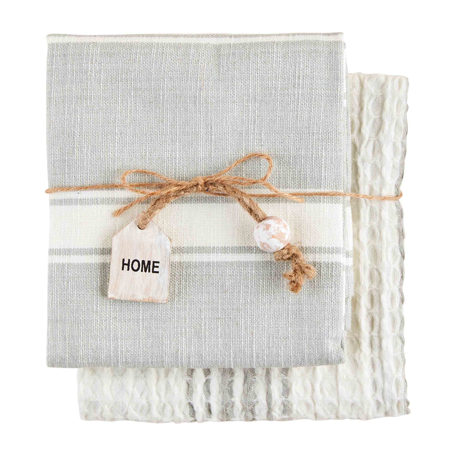 Send housewarming wishes with our Gray Waffle Dish Towel Set. The two piece set comes with two waffle weave and woven cotton dish towels. One towel features a gray and white striped pattern. The other features a different gray and white striped pattern and waffle weave texture.