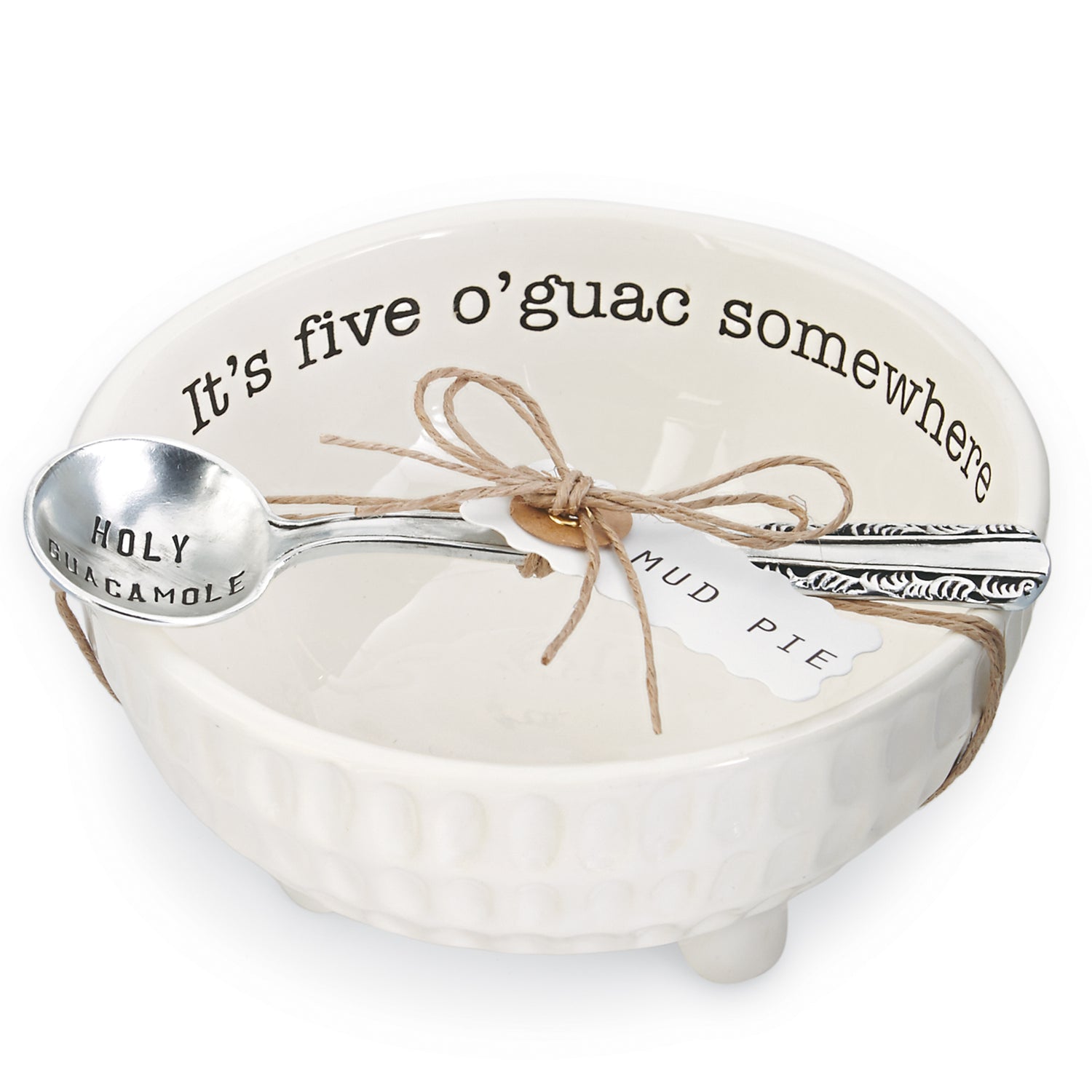 Holy gucamole, we love this circa guacamole dip cup set. The two piece set comes with a ceramic dimple textured Gucamole dip bowl. The dip bowl features the "It's five o'guac somewhere" sentiment on interior rim and arrives with "HOLY GUACAMOLE" stamped silverplate spoon. We love giving this as a wedding, housewarming or hostess gift for friends to use in their kitchen. And a perfect addition to Mexican night on Taco Tuesday!