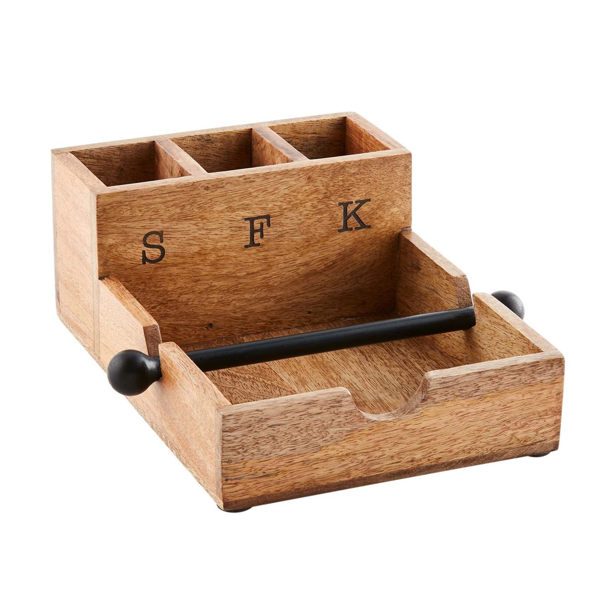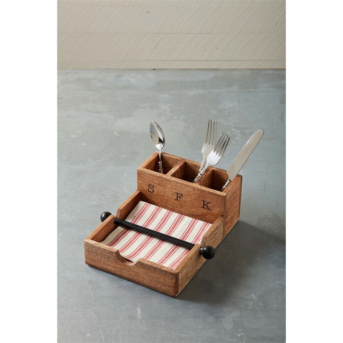 Our functional napkin and utensil holder are a must have for your kitchen. The mango wood napkin basket features a metal weight. The napkin basket features three attached utensil wells with engraved identifiers for spoons, forks and knifes. The utensil holder is made of mango wood and should be wiped clean with a soft dry cloth.