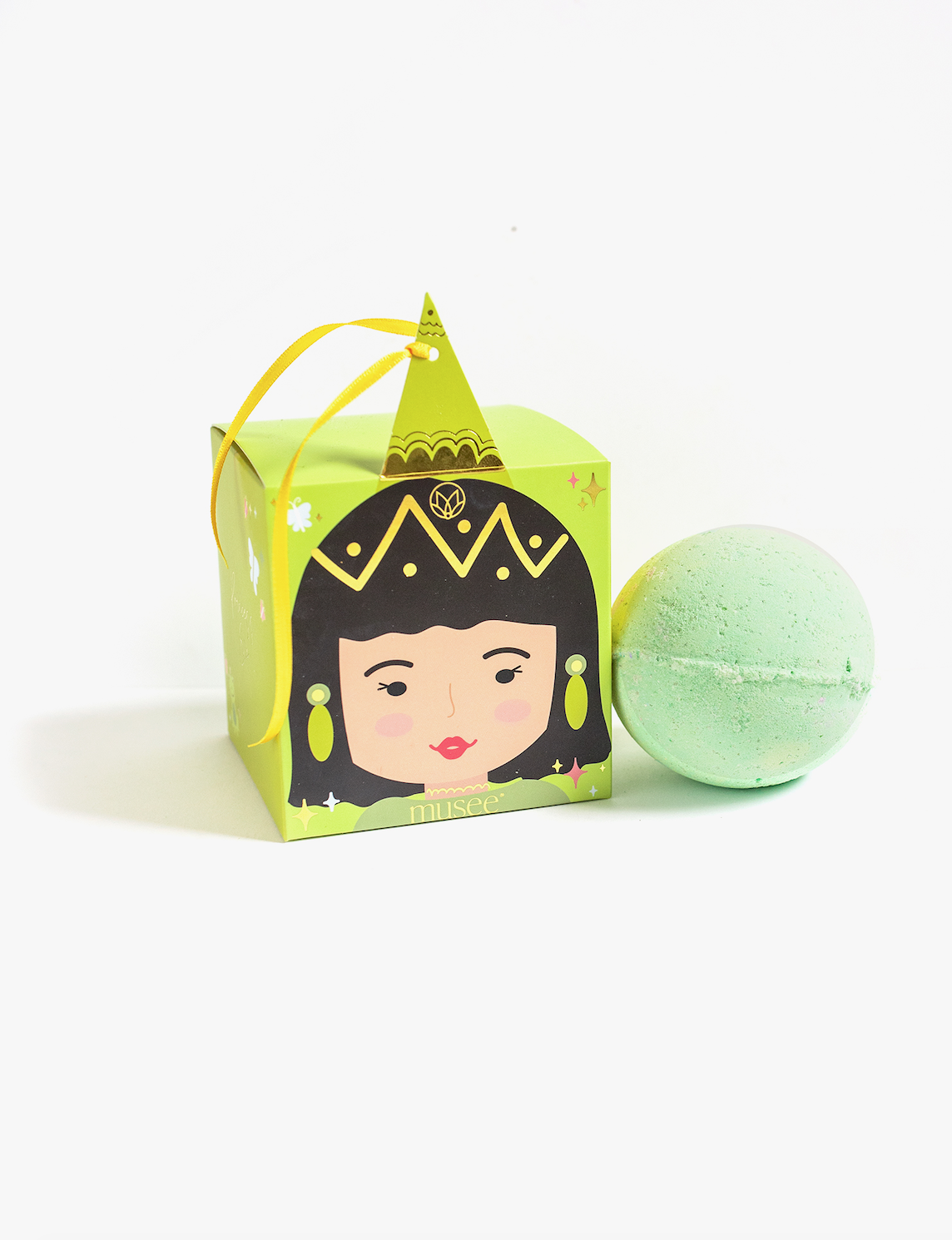 Create the most enchanting bath time with Princess Evie! As you soak in the swirls of emerald waters, pretend you are a princess too! Discover a magical ring when the bath balm dissolves! Try all of our Musee Princess Bath Balms to collect all of the special treasures inside! Sodium Bicarbonate, Citric Acid, Natural Apricot Oil, Lime Essential Oil, Fragrance, and Coloreze. Surprise - Princess Ring
