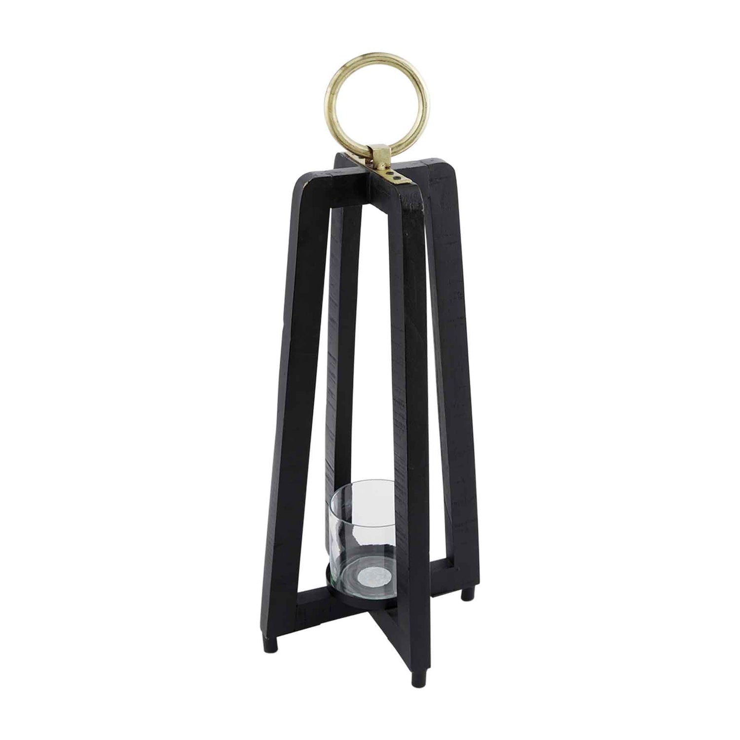 Our Black Tall Lantern is almost too good to be true! The black lantern is made from mango wood. The lantern features a center glass hurricane for adding your favorite candle. The lantern also features a brass finished ring finial that could be used to hang the lantern.