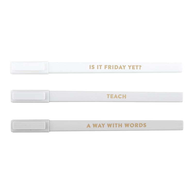 - Pens read "Is it Friday Yet?, Teach, A Way With Words"