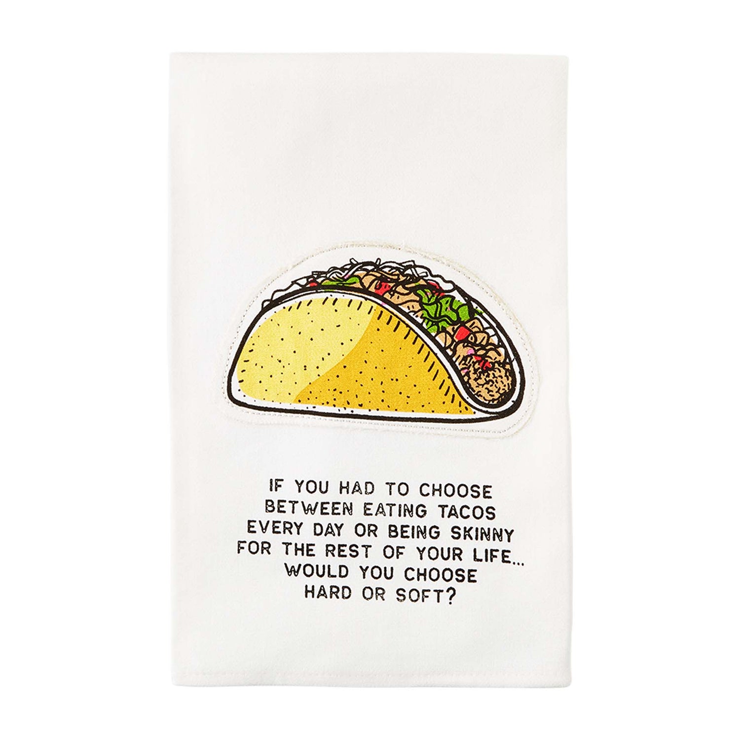 Printed cotton hand towel features frayed edge flour sack applique. Your friends will love this eating tacos hand towel. The printed cotton hand towel features frayed edge and flour sack applique. The front of the handle features an image of a taco. Below the taco image the hand towel reads "If you had to choose between eating tacos every day or being skinny for the rest of your life...would you choose hard or soft?"